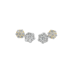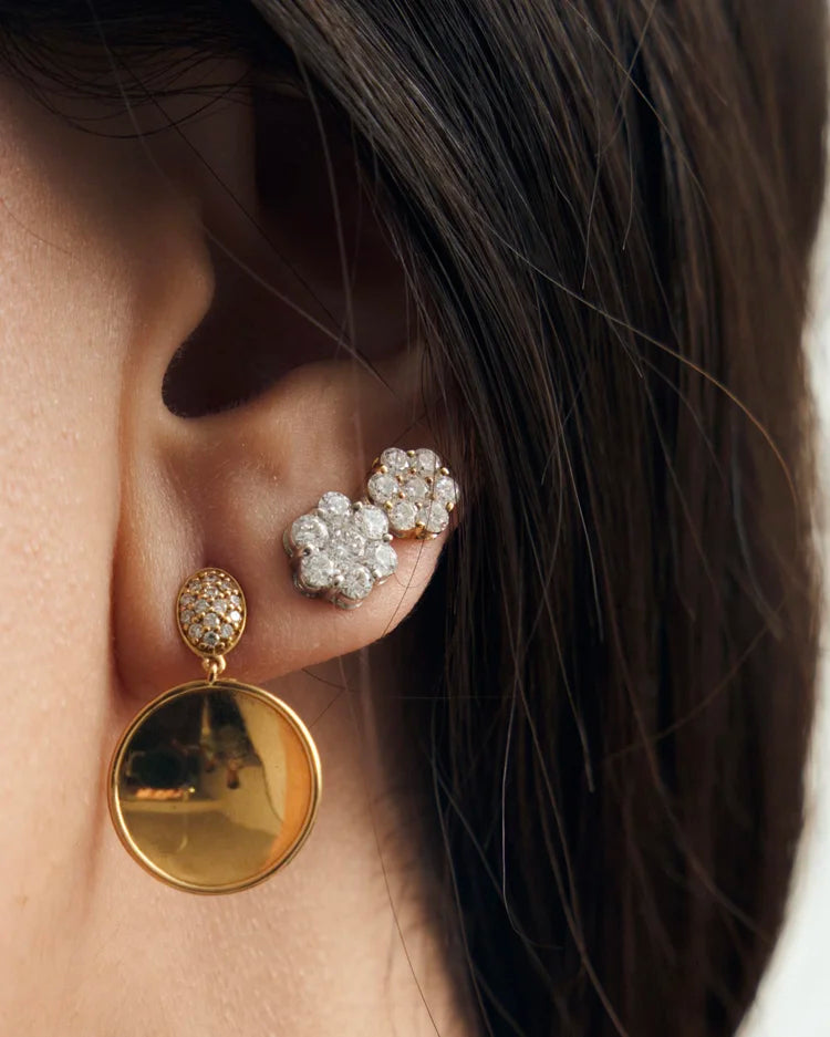 The earrings feature a larger rositas stud in white gold and a smaller rositas stud in yellow gold, offering a versatile modern twist — a chic ear climber or a dainty dangling, great for everyday wear.