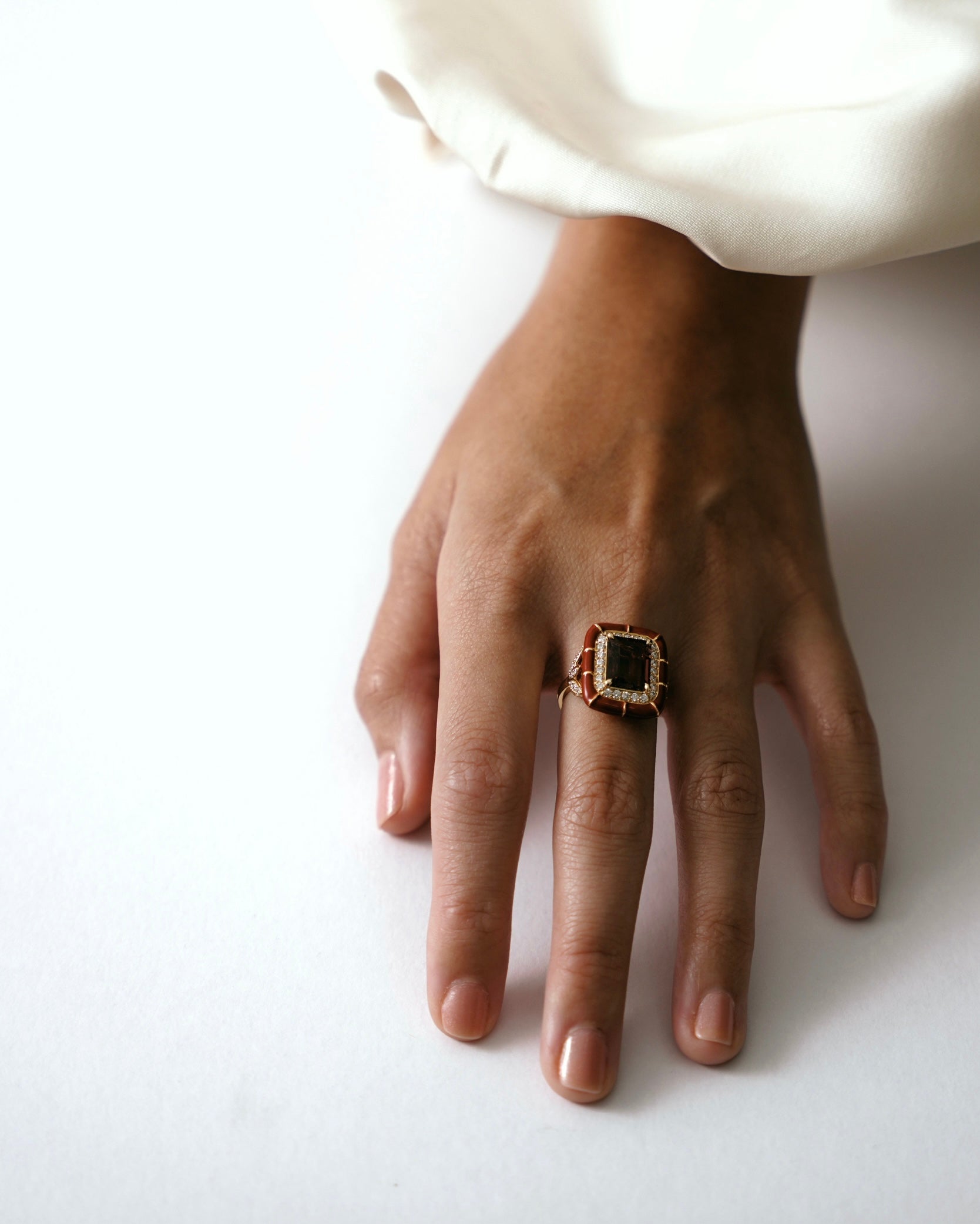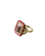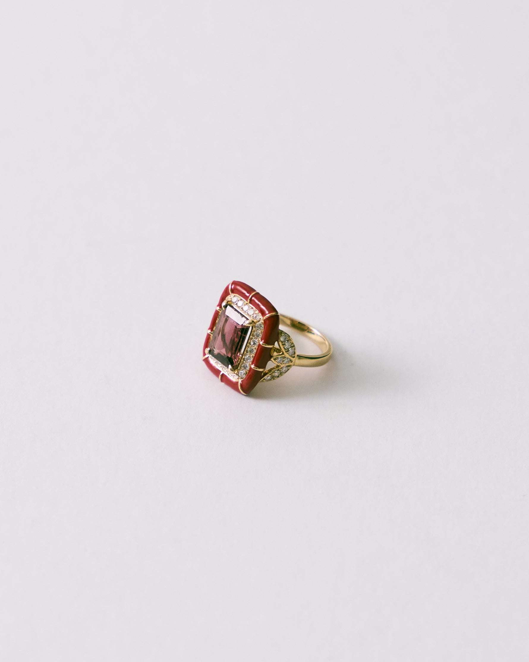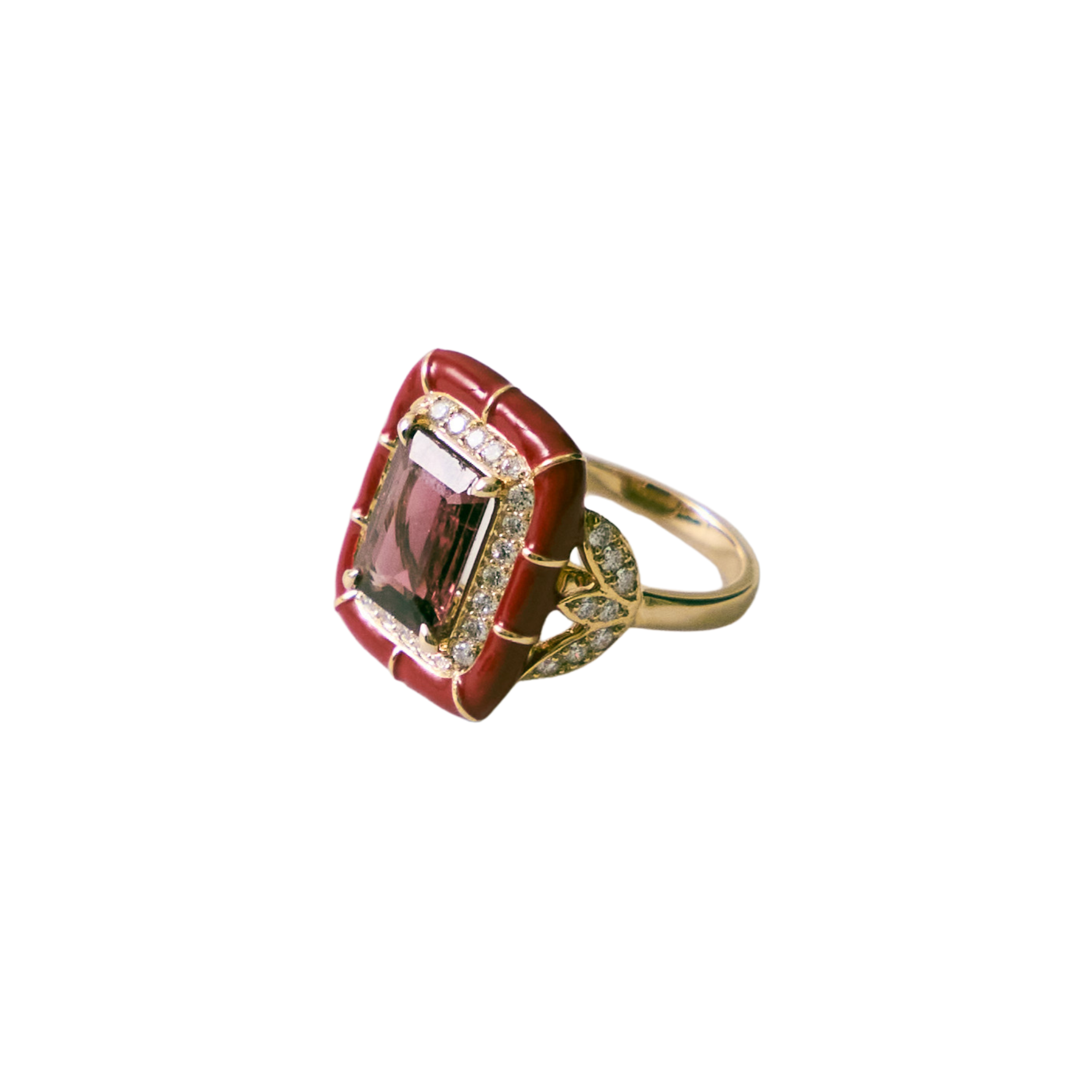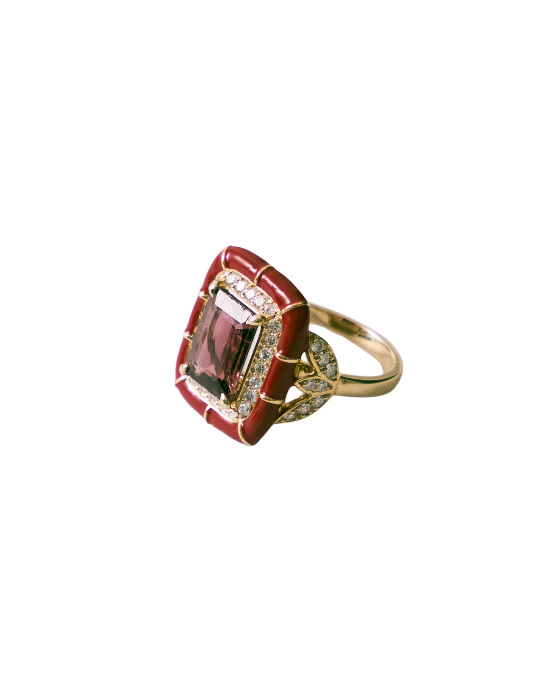 2.65ct Tourmaline | 0.59ct Natural Diamonds | Red enamel | 14k Yellow Gold